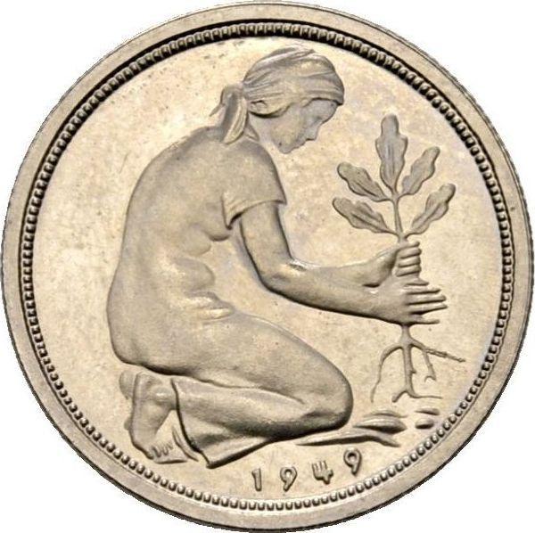 According to the latest data as of December 5, 2025 the average price of a coin 50 Pfennig 1949 "Bank deutscher Länder" with mark J is 85 USD for regular strike and 170 USD for coins minted using the PROOF technology. The coin is made of non-precious metal, so in poor condition it may have extremely low value and liquidity.