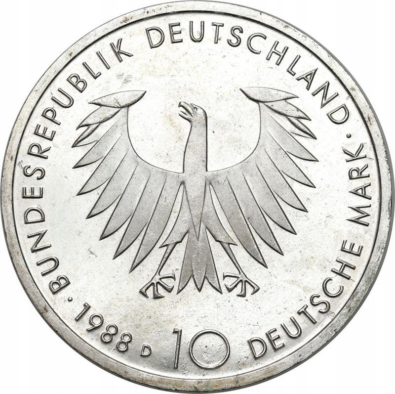 Find out the current coin value of the German 10 Mark 1988 "Schopenhauer" with mark D. This silver coin from the times FRG struck at the Munich Mint. Wondering how much a coin like this is worth? The record price belongs to the lot 2579 sold at the Auktionen Meister & Sonntag auction for EUR 380. Bidding took place November 27, 2012.