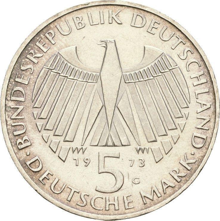 According to the latest data as of December 5, 2025 the average price of a Silver coin 5 Mark 1973 "Frankfurt Parliament" with mark G is 8 USD for regular strike and 9 USD for coins minted using the PROOF technology.