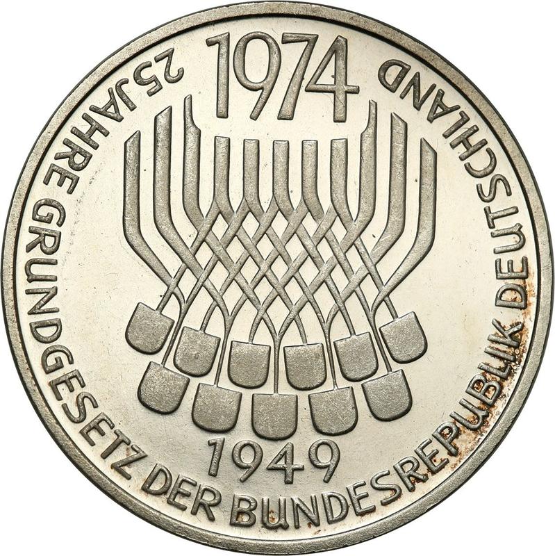 Find out the current coin value of the German 5 Mark 1974 "Basic Law" with mark F. This silver coin from the times FRG struck at the Stuttgart Mint. Wondering how much a coin like this is worth? The record price belongs to the lot 389601 sold at the Warszawskie Centrum Numizmatyczne auction for PLN 85. Bidding took place March 14, 2024.