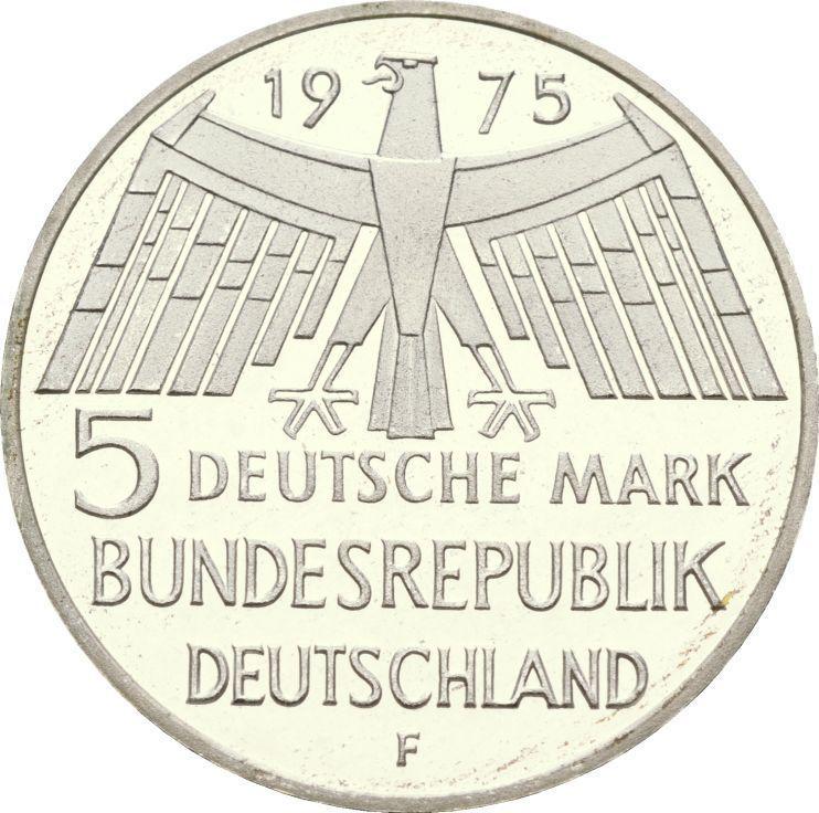 Find out the current coin value of the German 5 Mark 1975 "Year of Monument Protection" with mark F. This silver coin from the times FRG struck at the Stuttgart Mint. Wondering how much a coin like this is worth? The record price belongs to the lot 64147 sold at the Heritage Auctions auction for USD 76. Bidding took place November 26, 2015.