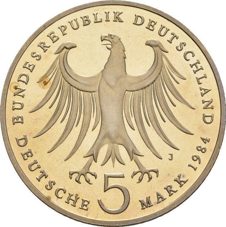 Find out the current coin value of the German 5 Mark 1984 "Mendelssohn" with mark J. This copper-nickel coin from the times FRG struck at the Hamburg Mint. Wondering how much a coin like this is worth? The record price belongs to the lot 2374 sold at the GERHARD HIRSCH Nachfolger auction for EUR 100. Bidding took place May 11, 2017.