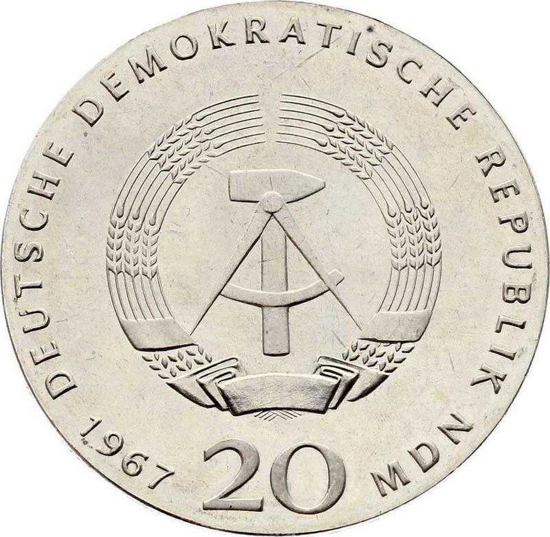 Find out the current coin value of the German 20 Mark 1967 "Humboldt". Edge (20 MARK * 20 MARK * 20 MARK). This silver coin from the times GDR struck at the Berlin Mint. Wondering how much a coin like this is worth? The record price belongs to the lot 1939 sold at the Rhenumis auction for EUR 2,500. Bidding took place November 24, 2020.