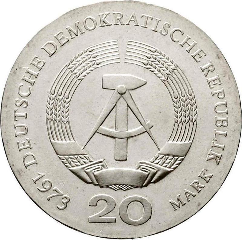 Find out the current coin value of the German 20 Mark 1973 "August Bebel". Double inscription on the edge. This silver coin from the times GDR struck at the Berlin Mint