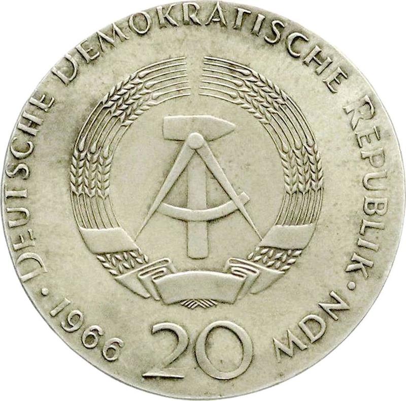 Find out the current coin value of the German 20 Mark 1966 "Leibniz". Edge (10 MARK DER DEUTSCHEN NOTENBANK). This silver coin from the times GDR struck at the Berlin Mint. Wondering how much a coin like this is worth? The record price belongs to the lot 3332 sold at the Teutoburger Münzauktion GmbH auction for EUR 5,250. Bidding took place December 1, 2020.