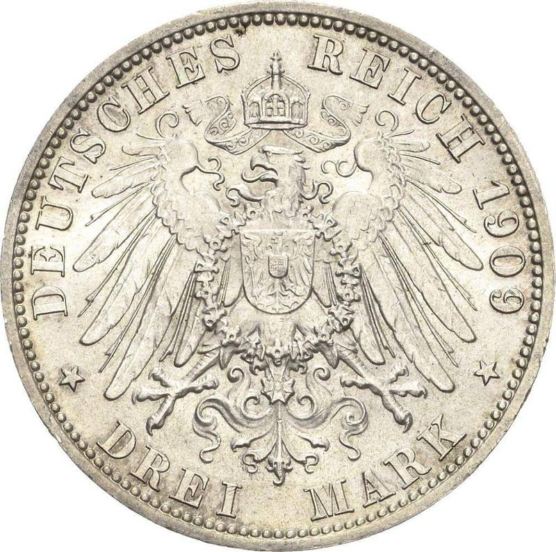 The information on the current value of the German coin 3 Mark 1909 "Anhalt" with the letters A is based on actual auction sales of similar specimens. To reflect the current price level, our service monitors over 590 numismatic companies and records auction results in the coin catalog and auction archive. Please note that the exact value depends directly on the coin's condition, so the average price serves only as an approximate estimate.