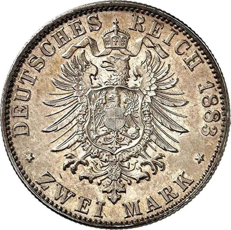 The information on the current value of the German coin 2 Mark 1883 "Baden" with the letters G is based on actual auction sales of similar specimens. To reflect the current price level, our service monitors over 590 numismatic companies and records auction results in the coin catalog and auction archive. Please note that the exact value depends directly on the coin's condition, so the average price serves only as an approximate estimate.