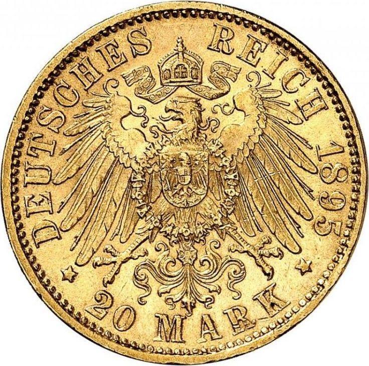 Find out the current coin value of the German 20 Mark 1895 "Bayern" with mark D. This gold coin from the times of German Empire struck at the Munich Mint. Wondering how much a coin like this is worth? The record price belongs to the lot 106 sold at the Universum Coins GmbH auction for EUR 9,500. Bidding took place November 17, 2022.