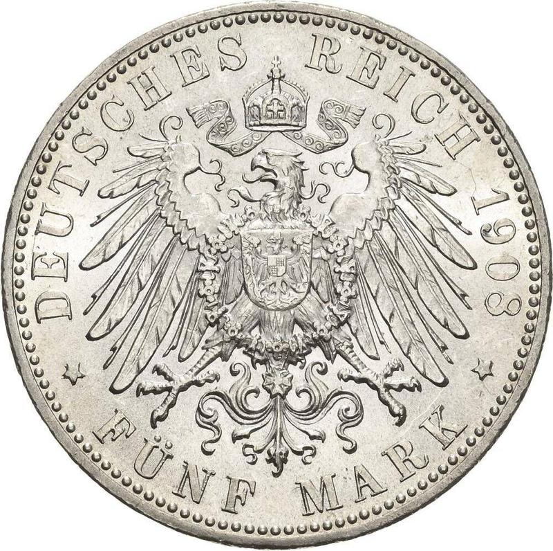 Find out the current coin value of the German 5 Mark 1908 "Bayern" with mark D. This silver coin from the times of German Empire struck at the Munich Mint. Wondering how much a coin like this is worth? The record price belongs to the lot 4503 sold at the Fritz Rudolf Künker GmbH & Co. KG auction for EUR 3,200. Bidding took place March 25, 2022.