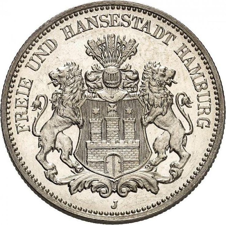 According to the latest data as of December 6, 2025 the average price of a Silver coin 2 Mark 1914 "Hamburg" with mark J is 250 USD for regular strike and 470 USD for coins minted using the PROOF technology.