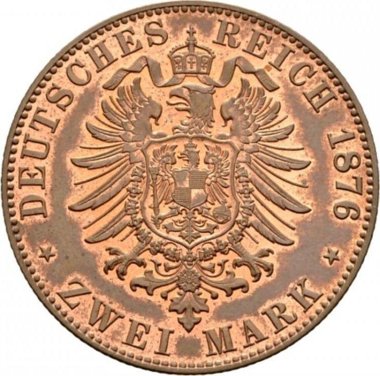 Find out the current coin value of the German 2 Mark 1876 "Hamburg" with mark J. Copper. Pattern. This copper coin from the times of German Empire struck at the Hamburg Mint. Wondering how much a coin like this is worth? The record price belongs to the lot 1635 sold at the Münzenhandlung Harald Möller GmbH auction for EUR 1,200. Bidding took place December 2, 2013.