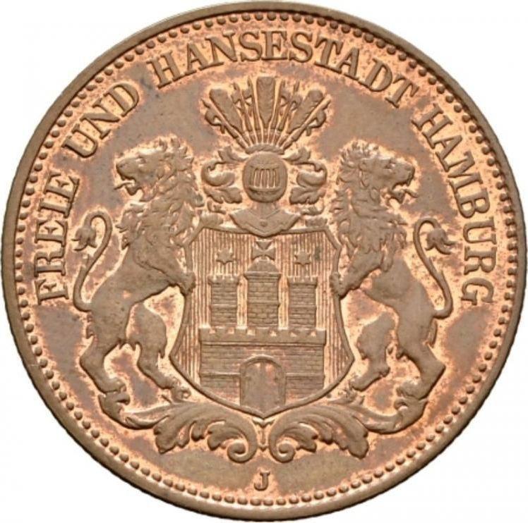 2 Mark 1876 J "Hamburg". Copper. Pattern (Germany, German Empire)