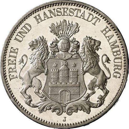 According to the latest data as of December 5, 2025 the average price of a Silver coin 5 Mark 1875 "Hamburg" with mark J is 770 USD for regular strike and 6300 USD for coins minted using the PROOF technology.