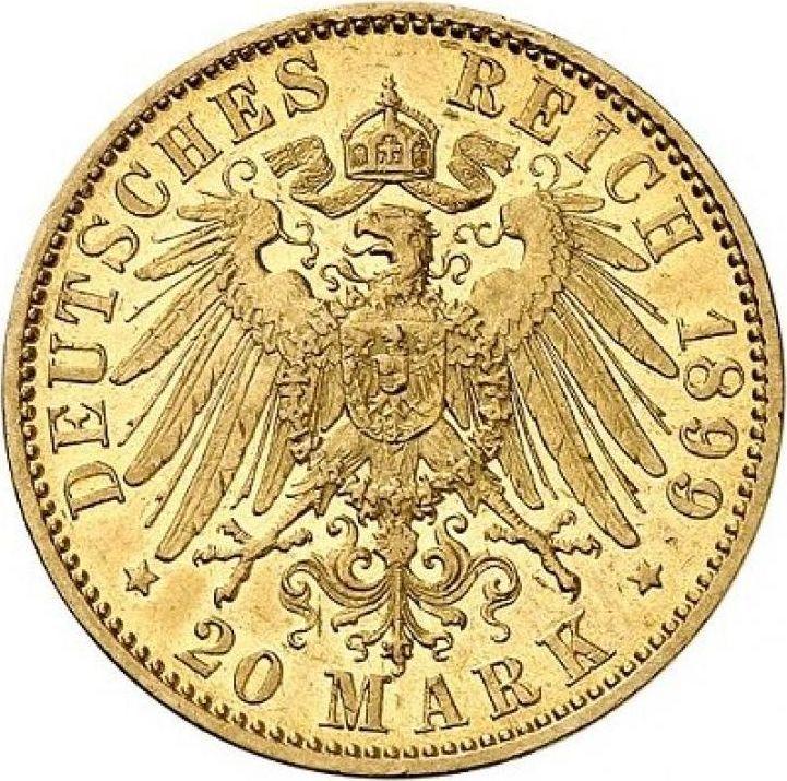 Find out the current coin value of the German 20 Mark 1899 "Hesse" with mark A. This gold coin from the times of German Empire struck at the Berlin Mint. Wondering how much a coin like this is worth? The record price belongs to the lot 2978 sold at the Fritz Rudolf Künker GmbH & Co. KG auction for EUR 3,600. Bidding took place March 10, 2015.