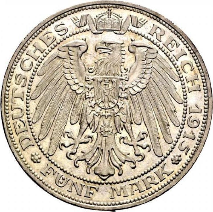 Find out the current coin value of the German 5 Mark 1915 "Mecklenburg-Schwerin" with mark A. 100th anniversary. This silver coin from the times of German Empire struck at the Berlin Mint. Wondering how much a coin like this is worth? The record price belongs to the lot 708 sold at the Fritz Rudolf Künker GmbH & Co. KG auction for EUR 28,000. Bidding took place June 20, 2022.