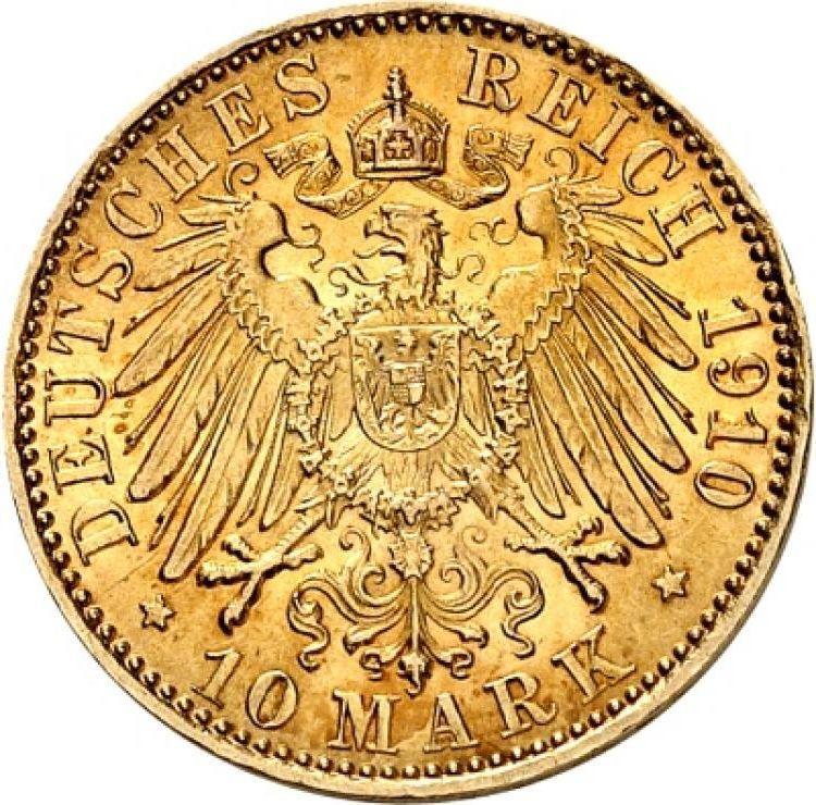 Find out the current coin value of the German 10 Mark 1910 "Prussia" with mark A. This gold coin from the times of German Empire struck at the Berlin Mint. Wondering how much a coin like this is worth? The record price belongs to the lot 1250 sold at the Fritz Rudolf Künker GmbH & Co. KG auction for EUR 3,000. Bidding took place March 10, 2014.