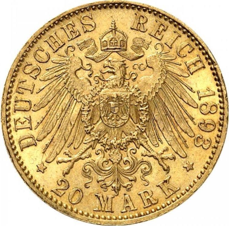 The information on the current value of the German coin 20 Mark 1893 "Prussia" with the letters A is based on actual auction sales of similar specimens. To reflect the current price level, our service monitors over 590 numismatic companies and records auction results in the coin catalog and auction archive. Please note that the exact value depends directly on the coin's condition, so the average price serves only as an approximate estimate.