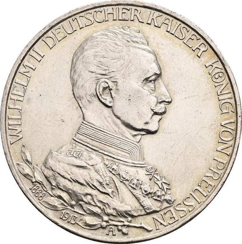According to the latest data as of December 5, 2025 the average price of a Silver coin 3 Mark 1913 "Prussia" with mark A, 25th years of the reign is 65 USD for regular strike and 280 USD for coins minted using the PROOF technology.