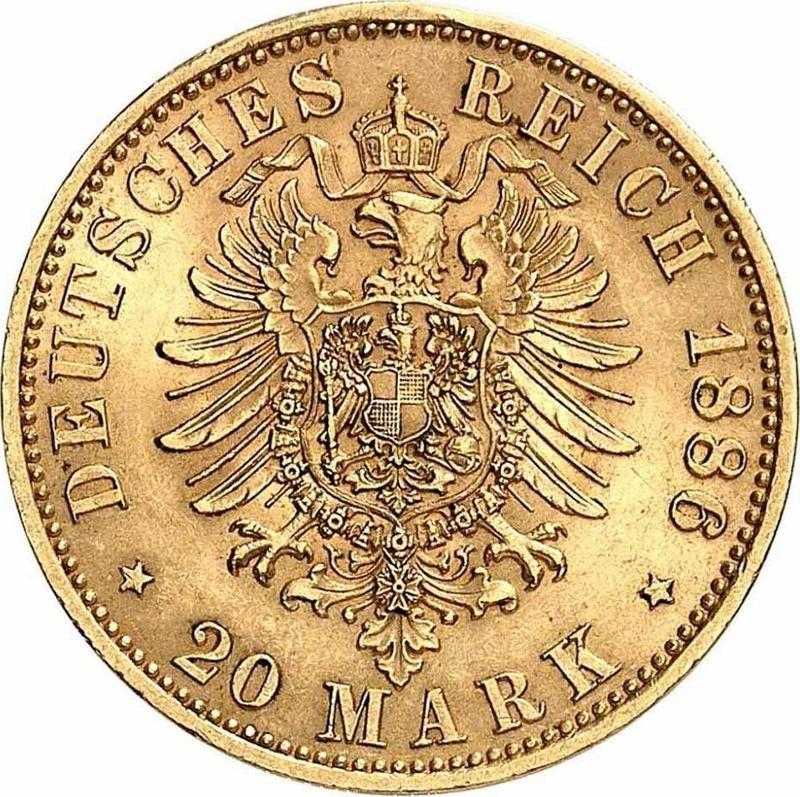 Find out the current coin value of the German 20 Mark 1886 "Saxe-Coburg-Gotha" with mark A. This gold coin from the times of German Empire struck at the Berlin Mint. Wondering how much a coin like this is worth? The record price belongs to the lot 6514 sold at the Fritz Rudolf Künker GmbH & Co. KG auction for EUR 8,000. Bidding took place October 11, 2007.