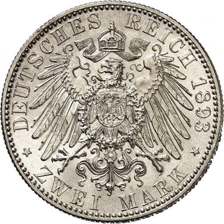 The information on the current value of the German coin 2 Mark 1893 "Saxony" with the letters E is based on actual auction sales of similar specimens. To reflect the current price level, our service monitors over 590 numismatic companies and records auction results in the coin catalog and auction archive. Please note that the exact value depends directly on the coin's condition, so the average price serves only as an approximate estimate.