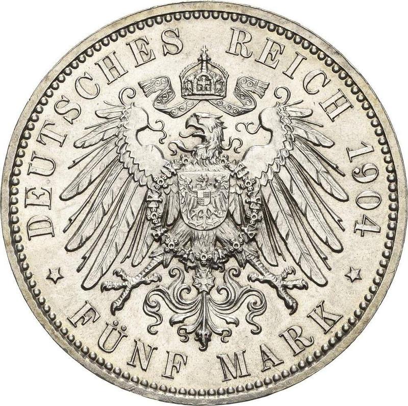 Find out the current coin value of the German 5 Mark 1904 "Saxony" with mark E. Life dates. This silver coin from the times of German Empire struck at the Muldenhutten Mint. Wondering how much a coin like this is worth? The record price belongs to the lot 1210 sold at the Dorotheum GmbH & Co KG auction for EUR 4,000. Bidding took place May 26, 2021.