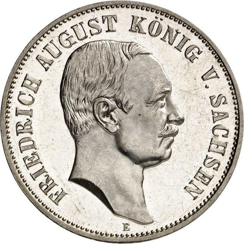 Find out the current coin value of the German 5 Mark 1914 "Saxony" with mark E. This silver coin from the times of German Empire struck at the Muldenhutten Mint. Wondering how much a coin like this is worth? The record price belongs to the lot 1843 sold at the Fritz Rudolf Künker GmbH & Co. KG auction for EUR 4,000. Bidding took place October 8, 2025.