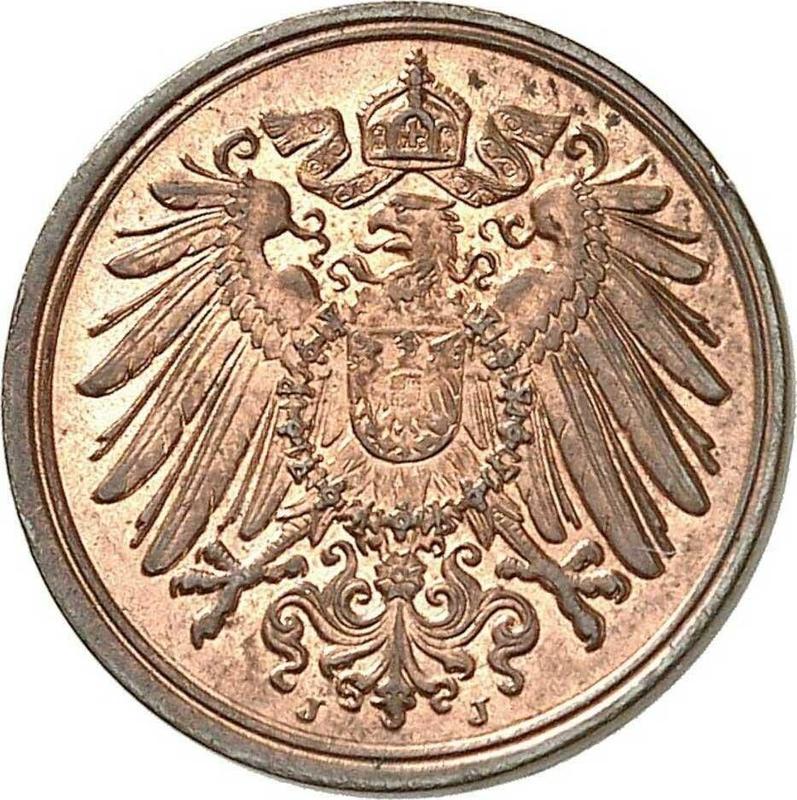 Find out the current coin value of the German 1 Pfennig 1901 with mark J. This copper coin from the times of German Empire struck at the Hamburg Mint. Wondering how much a coin like this is worth? The record price belongs to the lot 2063 sold at the Fritz Rudolf Künker GmbH & Co. KG auction for EUR 210. Bidding took place February 7, 2017.