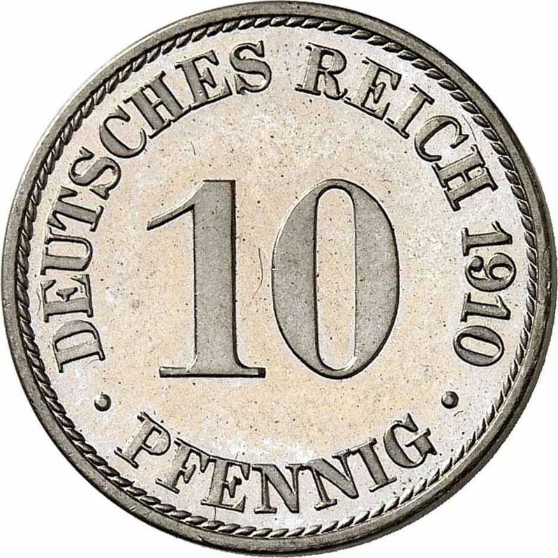 Find out the current coin value of the German 10 Pfennig 1910 with mark A. This copper-nickel coin from the times of German Empire struck at the Berlin Mint. Wondering how much a coin like this is worth? The record price belongs to the lot 2191 sold at the Fritz Rudolf Künker GmbH & Co. KG auction for EUR 220. Bidding took place February 7, 2017.