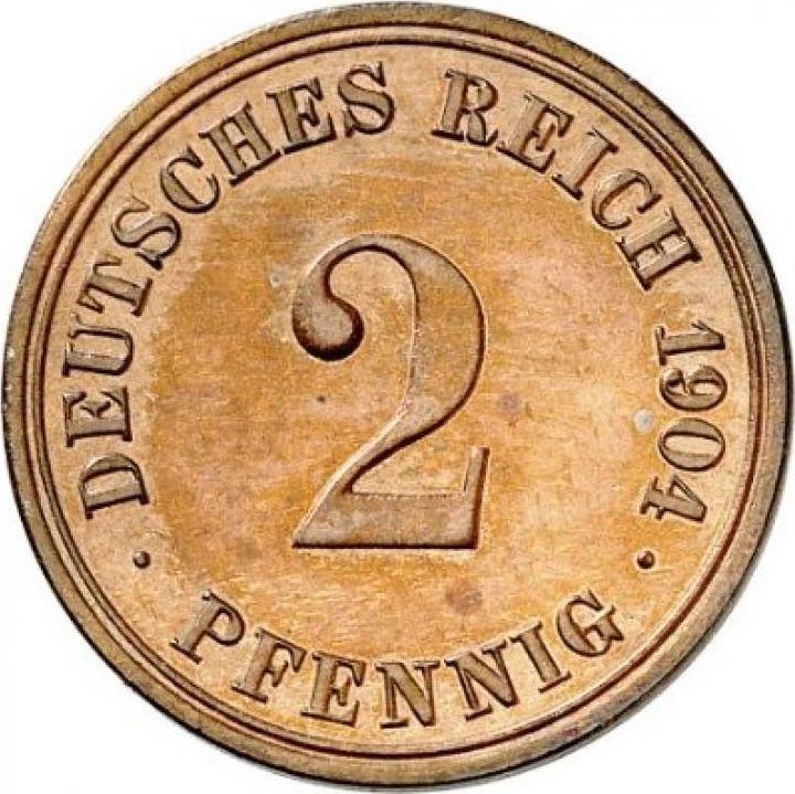 Find out the current coin value of the German 2 Pfennig 1904 with mark A. This copper coin from the times of German Empire struck at the Berlin Mint. Wondering how much a coin like this is worth? The record price belongs to the lot 2102 sold at the Fritz Rudolf Künker GmbH & Co. KG auction for EUR 220. Bidding took place February 7, 2017.