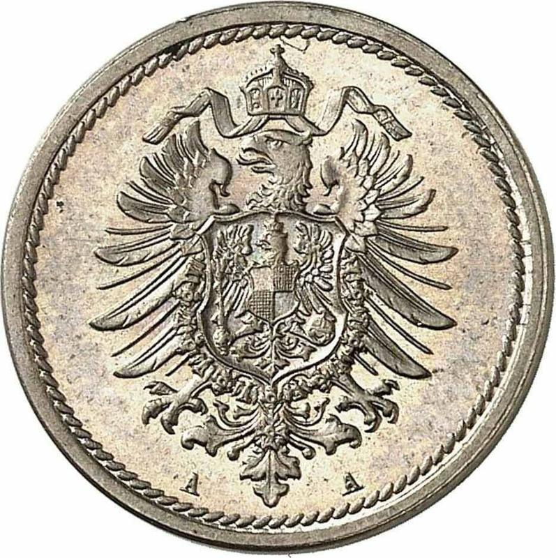 Find out the current coin value of the German 5 Pfennig 1876 with mark A. This copper-nickel coin from the times of German Empire struck at the Berlin Mint. Wondering how much a coin like this is worth? The record price belongs to the lot 3754 sold at the Heidelberger Münzhandlung Herbert Grün auction for EUR 170. Bidding took place May 10, 2021.