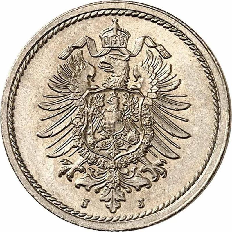 Find out the current coin value of the German 5 Pfennig 1888 with mark J. This copper-nickel coin from the times of German Empire struck at the Hamburg Mint. Wondering how much a coin like this is worth? The record price belongs to the lot 122 sold at the Heidelberger Münzhandlung Herbert Grün auction for EUR 120. Bidding took place May 17, 2017.