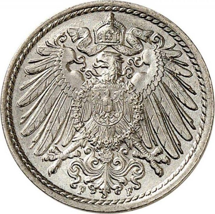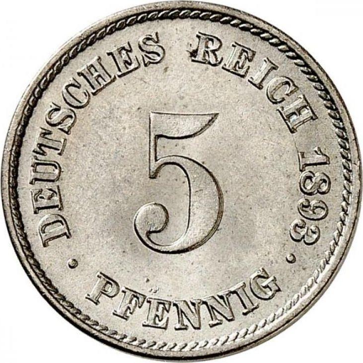 Find out the current coin value of the German 5 Pfennig 1893 with mark F. This copper-nickel coin from the times of German Empire struck at the Stuttgart Mint. Wondering how much a coin like this is worth? The record price belongs to the lot 2137 sold at the Fritz Rudolf Künker GmbH & Co. KG auction for EUR 240. Bidding took place February 7, 2017.