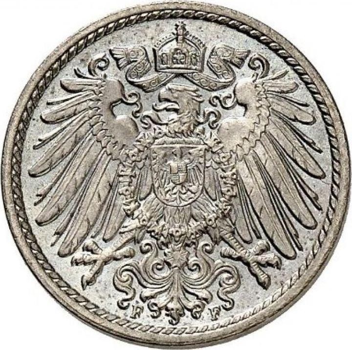 Find out the current coin value of the German 5 Pfennig 1898 with mark F. This copper-nickel coin from the times of German Empire struck at the Stuttgart Mint. Wondering how much a coin like this is worth? The record price belongs to the lot 1849 sold at the Heidelberger Münzhandlung Herbert Grün auction for EUR 110. Bidding took place November 14, 2022.