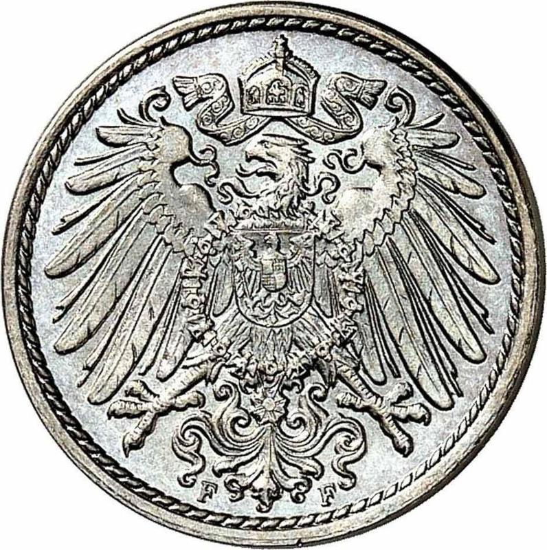 According to the latest data as of December 6, 2025 the average price of a coin 5 Pfennig 1900 with mark F is 95 USD. The coin is made of non-precious metal, so in poor condition it may have extremely low value and liquidity.