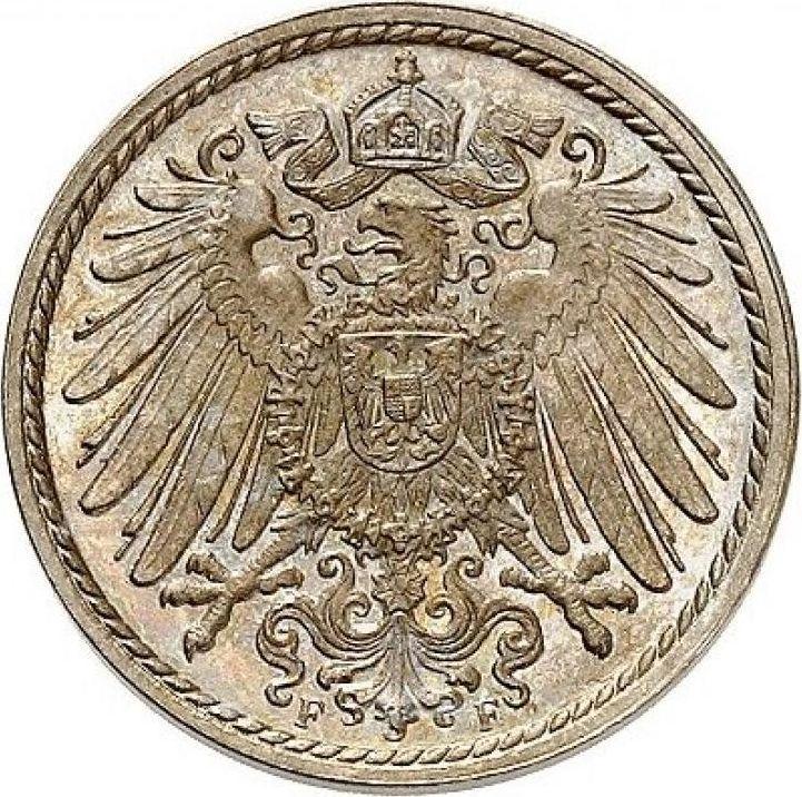 Find out the current coin value of the German 5 Pfennig 1913 with mark F. This copper-nickel coin from the times of German Empire struck at the Stuttgart Mint. Wondering how much a coin like this is worth? The record price belongs to the lot 1729 sold at the Auktionen Münzhandlung Sonntag auction for EUR 130. Bidding took place November 25, 2013.