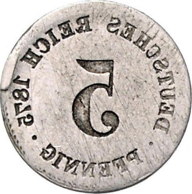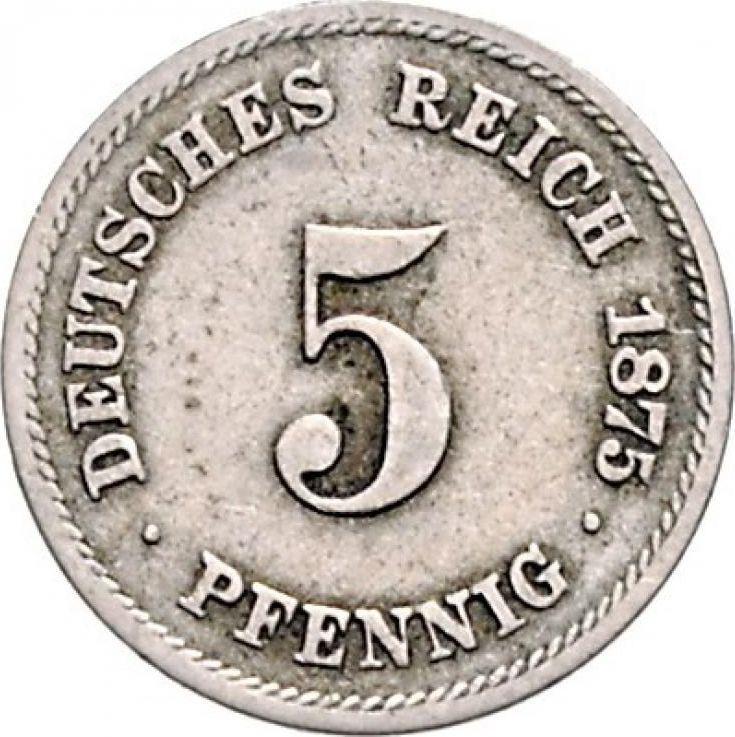Find out the current coin value of the German 5 Pfennig 1874-1889 . Incuse Error. This copper-nickel coin from the times of German Empire. Wondering how much a coin like this is worth? The record price belongs to the lot 470 sold at the Münzenhandlung Harald Möller GmbH auction for EUR 260. Bidding took place June 7, 2021.