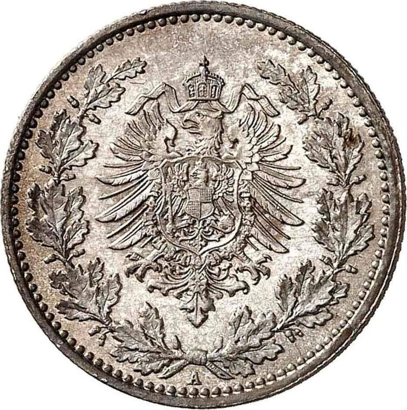 Find out the current coin value of the German 50 Pfennig 1877 with mark A. This silver coin from the times of German Empire struck at the Berlin Mint. Wondering how much a coin like this is worth? The record price belongs to the lot 2039 sold at the Fritz Rudolf Künker GmbH & Co. KG auction for EUR 1,050. Bidding took place February 7, 2017.