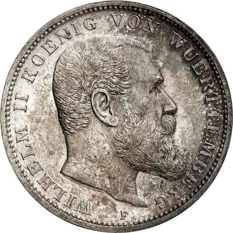 According to the latest data as of December 6, 2025 the average price of a Silver coin 3 Mark 1909 "Wurtenberg" with mark F is 70 USD for regular strike and 390 USD for coins minted using the PROOF technology.
