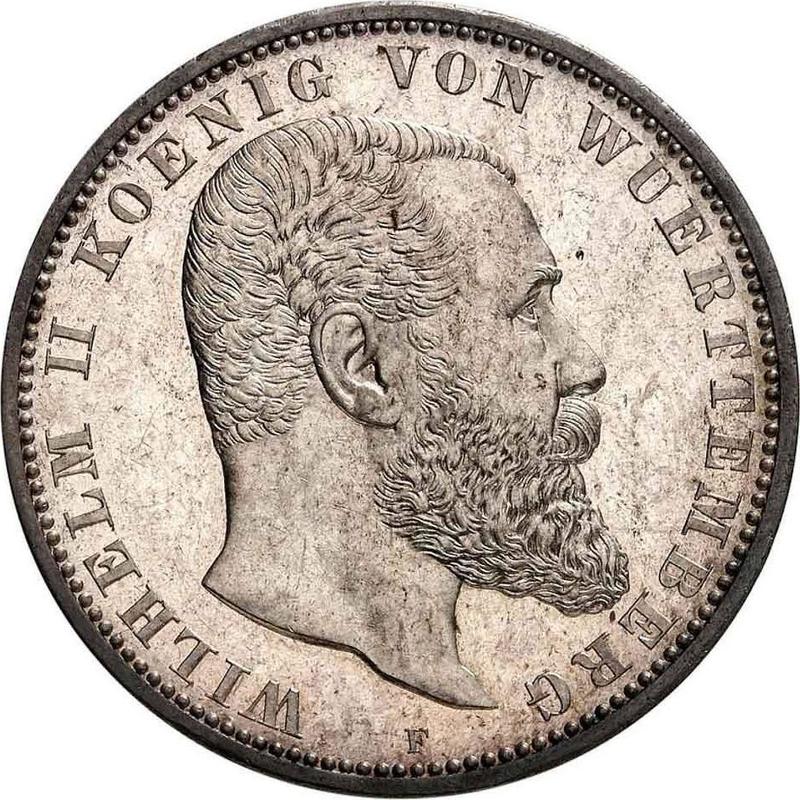 According to the latest data as of December 6, 2025 the average price of a Silver coin 5 Mark 1899 "Wurtenberg" with mark F is 590 USD for regular strike and 1900 USD for coins minted using the PROOF technology.