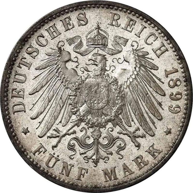 Find out the current coin value of the German 5 Mark 1899 "Wurtenberg" with mark F. This silver coin from the times of German Empire struck at the Stuttgart Mint. Wondering how much a coin like this is worth? The record price belongs to the lot 2440 sold at the Emporium Hamburg Münzhandelsgesellschaft mbH auction for EUR 1,850. Bidding took place November 13, 2014.