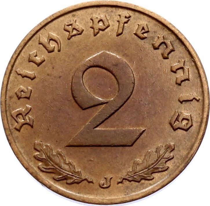 Find out the current coin value of the German 2 Reichspfennig 1937 with mark J. This bronze coin from the times Third Reich struck at the Hamburg Mint. Wondering how much a coin like this is worth? The record price belongs to the lot 1824 sold at the Katz Auction auction for EUR 11. Bidding took place July 3, 2019.