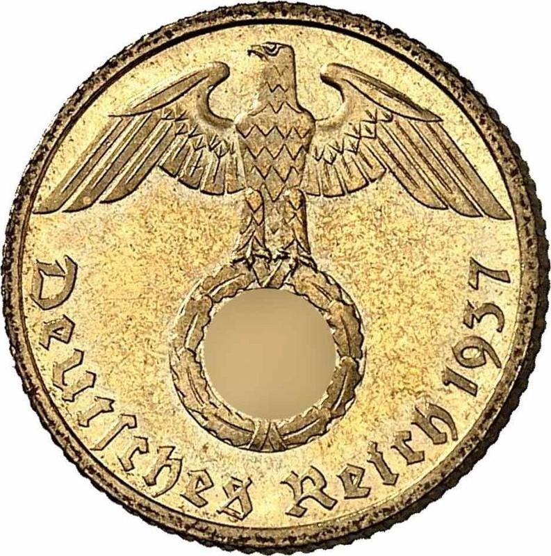 According to the latest data as of December 6, 2025 the average price of a coin 5 Reichspfennig 1937 with mark G is 390 USD for coins minted using the PROOF technology. The coin is made of non-precious metal, so in poor condition it may have extremely low value and liquidity.