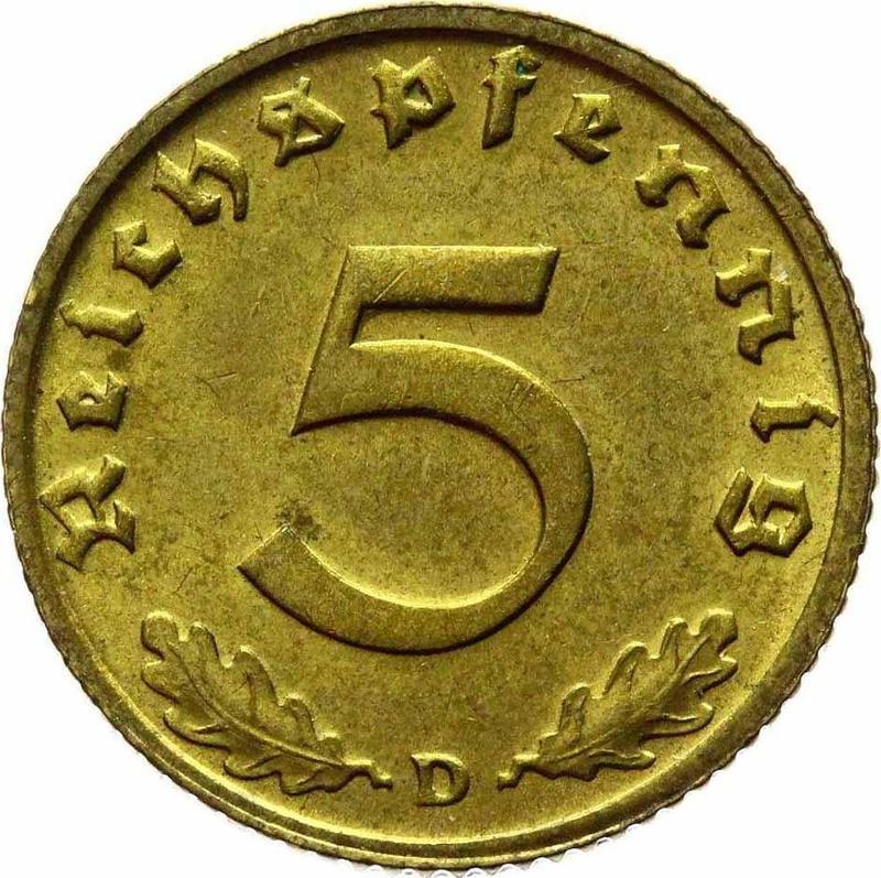 According to the latest data as of December 5, 2025 the average price of a coin 5 Reichspfennig 1938 with mark D is 6 USD. The coin is made of non-precious metal, so in poor condition it may have extremely low value and liquidity.
