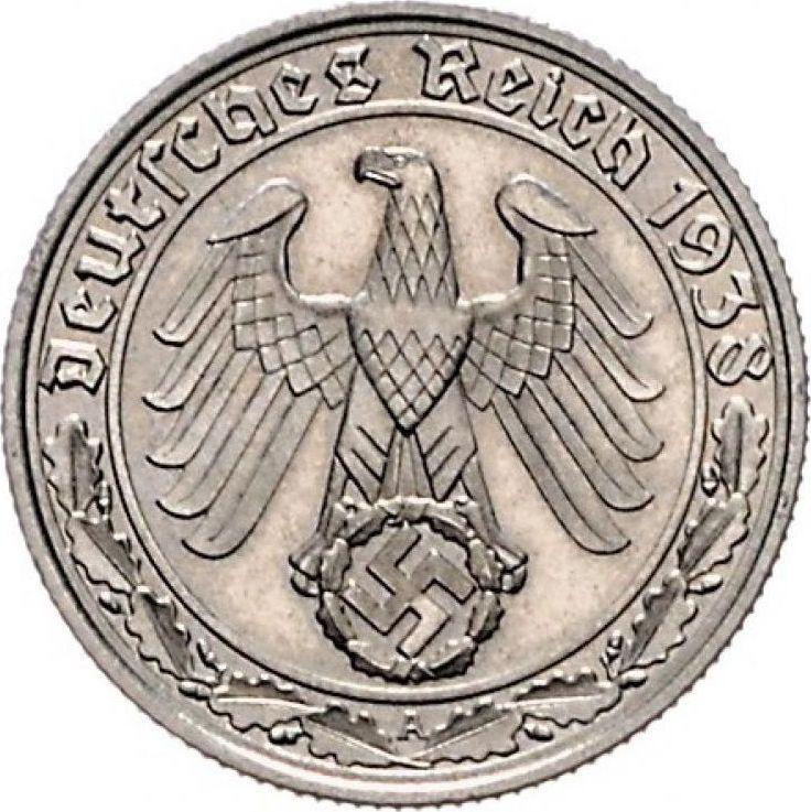 Find out the current coin value of the German 50 Reichspfennig 1938 with mark A. This nickel coin from the times Third Reich struck at the Berlin Mint. Wondering how much a coin like this is worth? The record price belongs to the lot 726 sold at the Classical Numismatic Group, LLC auction for USD 1,600. Bidding took place May 13, 2025.