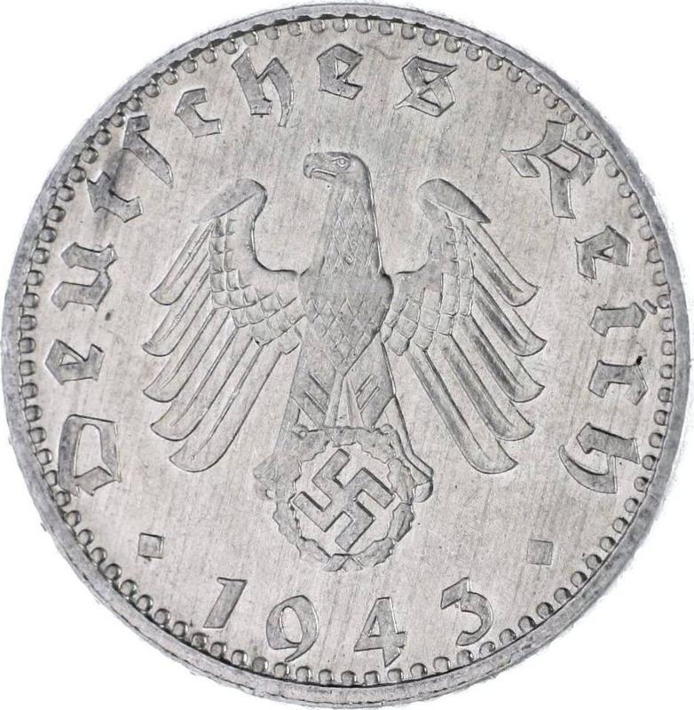 Find out the current coin value of the German 50 Reichspfennig 1943 with mark A. This aluminum coin from the times Third Reich struck at the Berlin Mint. Wondering how much a coin like this is worth? The record price belongs to the lot 942 sold at the Münzenhandlung Harald Möller GmbH auction for EUR 40. Bidding took place May 26, 2014.