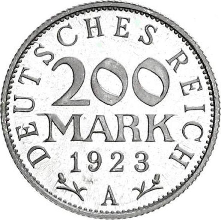 According to the latest data as of December 5, 2025 the average price of a coin 200 Mark 1923 with mark A is 20 USD for regular strike and 95 USD for coins minted using the PROOF technology. The coin is made of non-precious metal, so in poor condition it may have extremely low value and liquidity.