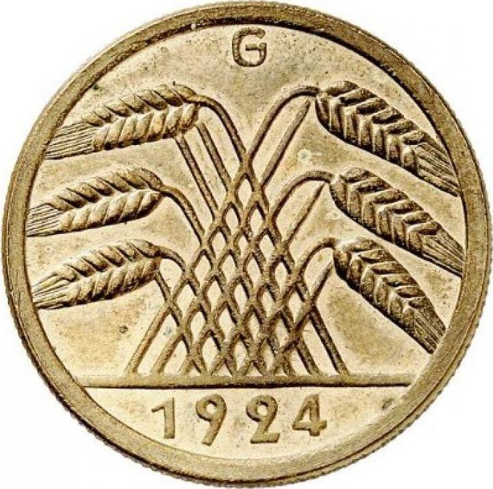 Find out the current coin value of the German 50 Reichspfennig 1924 with mark G. This aluminum-bronze coin from the times of Weimar Republic struck at the Karlsruhe Mint. Wondering how much a coin like this is worth? The record price belongs to the lot 24128 sold at the Heritage Auctions auction for USD 19,975. Bidding took place April 18, 2013.