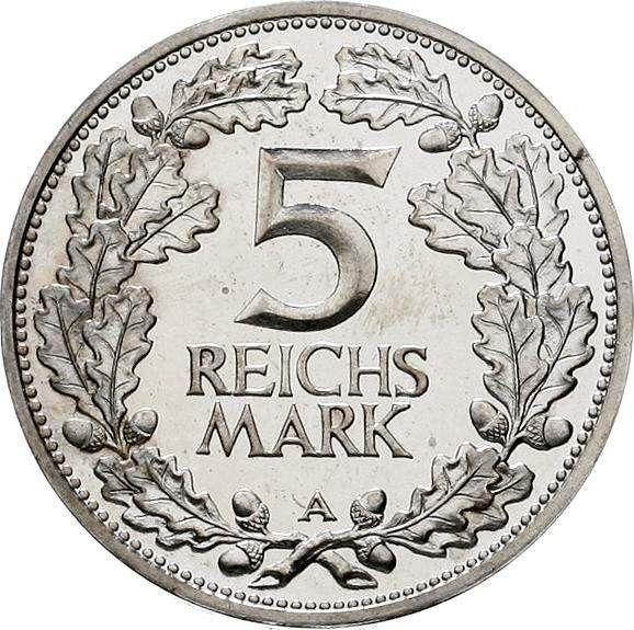 According to the latest data as of December 5, 2025 the average price of a Silver coin 5 Reichsmark 1925 "Rhineland" with mark A is 160 USD for regular strike and 760 USD for coins minted using the PROOF technology.