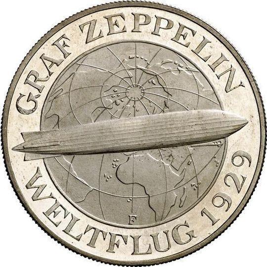 According to the latest data as of December 5, 2025 the average price of a Silver coin 5 Reichsmark 1930 "Zeppelin" with mark F is 270 USD for regular strike and 1500 USD for coins minted using the PROOF technology.
