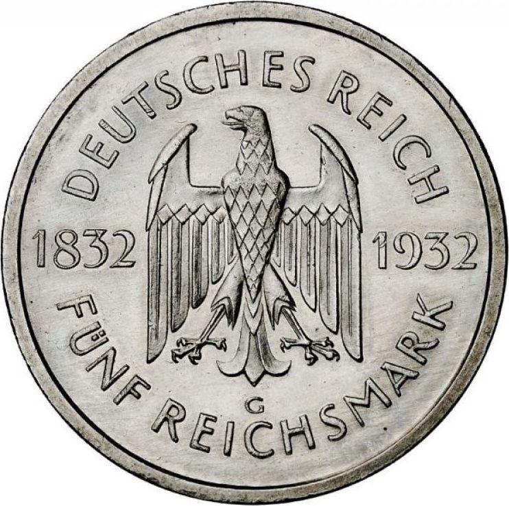 5 Reichsmark 1932 G "Goethe" (Germany, Weimar Republic)